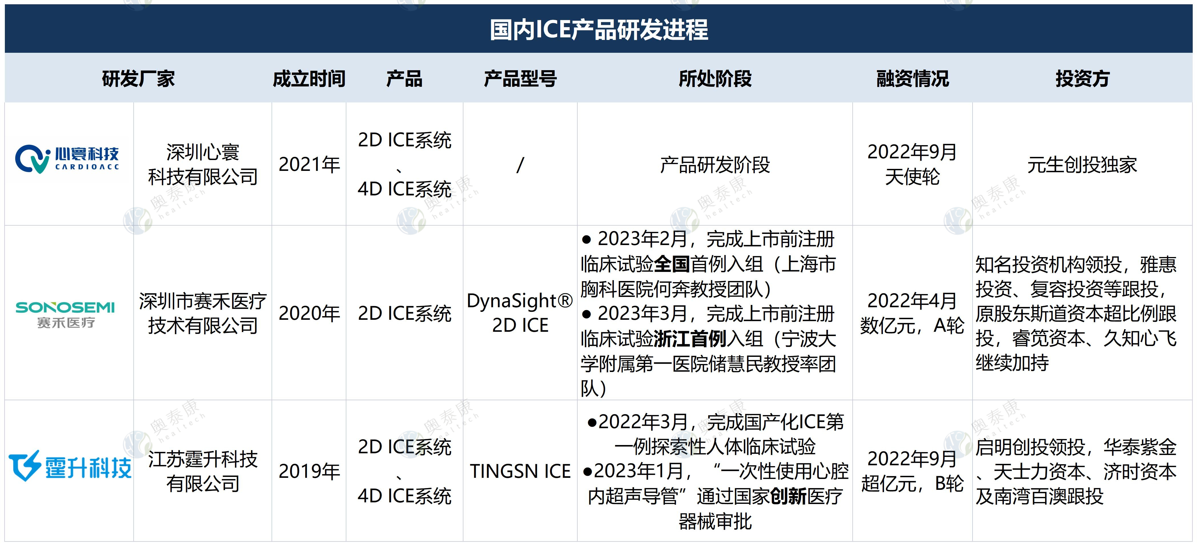 全球ICE市場(chǎng)中,歐美企業(yè)占主要份額,強(qiáng)生、雅培、西門(mén)子、飛利浦、GE醫(yī)療、波士頓科學(xué)等均已布局,而國(guó)內(nèi)ICE起步較晚,仍處發(fā)展初期,相關(guān)產(chǎn)品和市場(chǎng)滲透率較低,企業(yè)具有較大的發(fā)展空間,國(guó)內(nèi)研發(fā)廠商有塞禾醫(yī)療、心寰科技、霆升科技、澤樸醫(yī)療、歡影醫(yī)療等。隨著ICE在臨床應(yīng)用優(yōu)勢(shì)的凸顯,ICE賽道逐漸升溫并獲得資本青睞,國(guó)內(nèi)部分ICE廠家已在2022年完成新一輪融資。