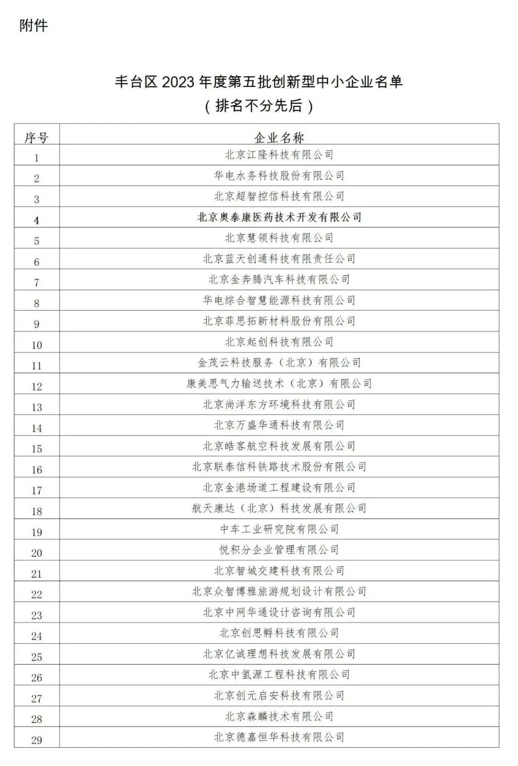 奧泰康入選豐臺(tái)區(qū)2023年度第五批創(chuàng)新型中小企業(yè)名單創(chuàng)新型中小企業(yè)