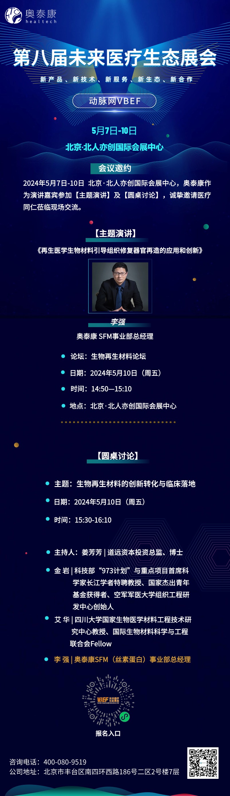 ??動(dòng)脈網(wǎng)·VBEF——第八屆未來醫(yī)療生態(tài)展會(huì),奧泰康·再生醫(yī)學(xué)生物材料演講???5月10日,與您相約??北京·北人亦創(chuàng)國際會(huì)展中心5月7日-10日,動(dòng)脈網(wǎng)VBEF第八屆未來醫(yī)療生態(tài)展會(huì)將于北京·北人亦創(chuàng)國際會(huì)展中心舉行,奧泰康作為演講嘉賓,受邀參加主題演講及圓桌討論,誠摯邀請(qǐng)醫(yī)療同仁屆時(shí)蒞臨現(xiàn)場交流。