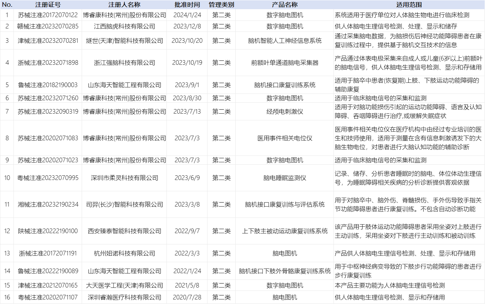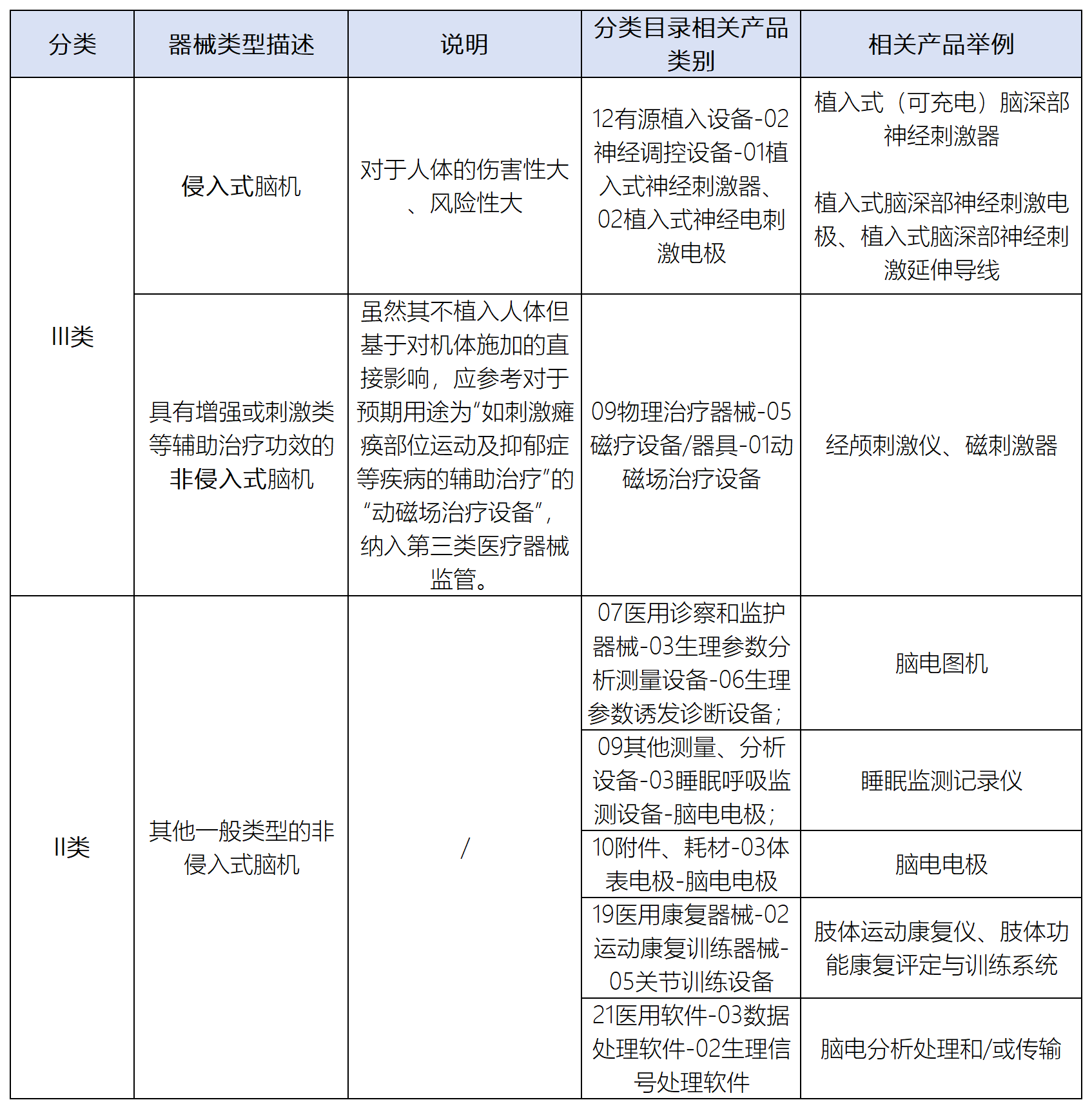 中國器審發(fā)布的《腦機接口的監(jiān)管現(xiàn)狀》指出,由于III類醫(yī)療器械在注冊難度、監(jiān)管要求、申請受理部門層級和申請時長等方面都遠高于II類醫(yī)療器械,我國腦機企業(yè)目前大多選擇非侵入式采集技術路線。對于侵入式腦機設備,目前都處在臨床性研究和動物實驗階段。目前暫無公開性的由國家藥品監(jiān)督管理局正式批準進入人體臨床試驗階段的侵入式腦機器械。根據(jù)廣義BCI的定義,結合我國現(xiàn)行《醫(yī)療器械分類目錄》的規(guī)定,與BCI相關設備的分類主要為II類和III類: