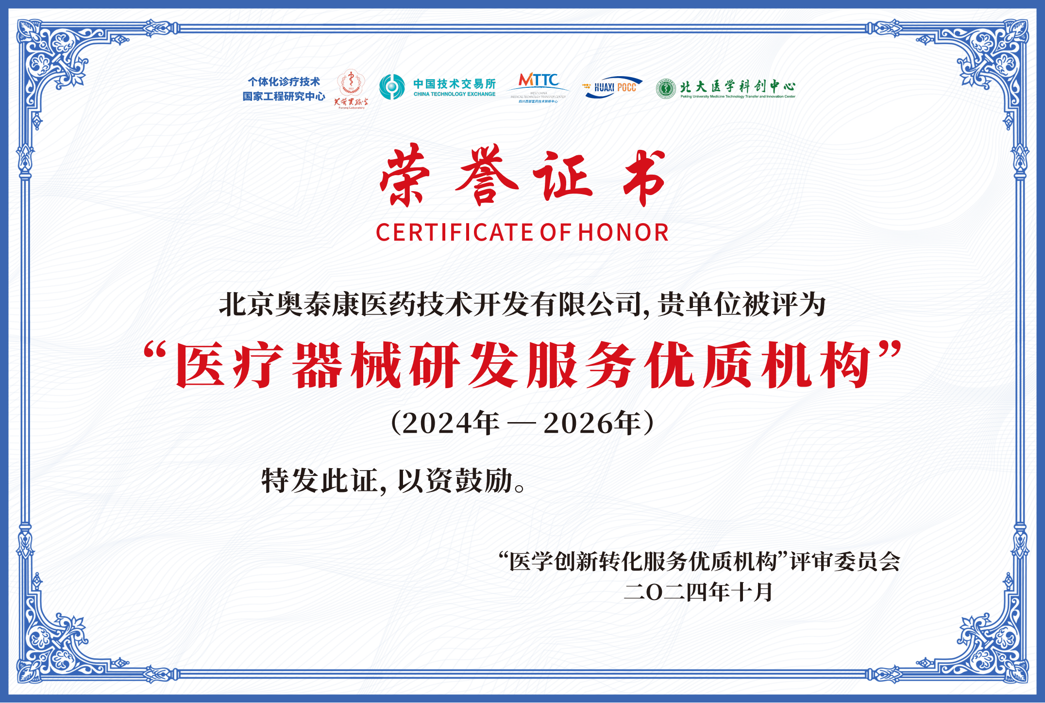個(gè)體化醫(yī)學(xué)研討會(huì)暨第四屆衛(wèi)生健康創(chuàng)新與轉(zhuǎn)化管理論壇落幕 ——奧泰康獲評(píng)2024年度“醫(yī)療器械研發(fā)服務(wù)優(yōu)質(zhì)機(jī)構(gòu)”???2024年10月14日,由中南大學(xué)、個(gè)體化診療技術(shù)國(guó)家工程研究中心、芙蓉實(shí)驗(yàn)室等單位聯(lián)合主辦的個(gè)體化醫(yī)學(xué)研討會(huì)暨第四屆衛(wèi)生健康創(chuàng)新與轉(zhuǎn)化管理論壇于海南落幕,會(huì)議聚集來(lái)自全國(guó)各地的專(zhuān)家學(xué)者、相關(guān)政府部門(mén)、醫(yī)療衛(wèi)生健康領(lǐng)域高校、科研院所、醫(yī)院、醫(yī)療健康大數(shù)據(jù)相關(guān)產(chǎn)業(yè)代表400余人參會(huì)。奧泰康應(yīng)邀參加大會(huì),并獲評(píng)2024年度“醫(yī)療器械研發(fā)服務(wù)優(yōu)質(zhì)機(jī)構(gòu)”。